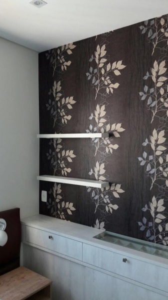 Aplicado rapidamente pode ser limpo com aspirador de pó e até ser aplicado um pano úmido, sendo apenas com água para limpeza e removido facilmente e sua parede pintada continuará intacta após a remoção do mesmo. Possuo vasta gama de álbuns de papéis de parede importados e nacional, onde levo até o local afim de orientar ao cliente o uso e aplicação em relação a cada ambiente, referente as texturas, desenhos e padrões decorativos. Seque alguns ambientes para ilustrar a aplicação do papel de parede de BENASSSI DECORAÇÕES.